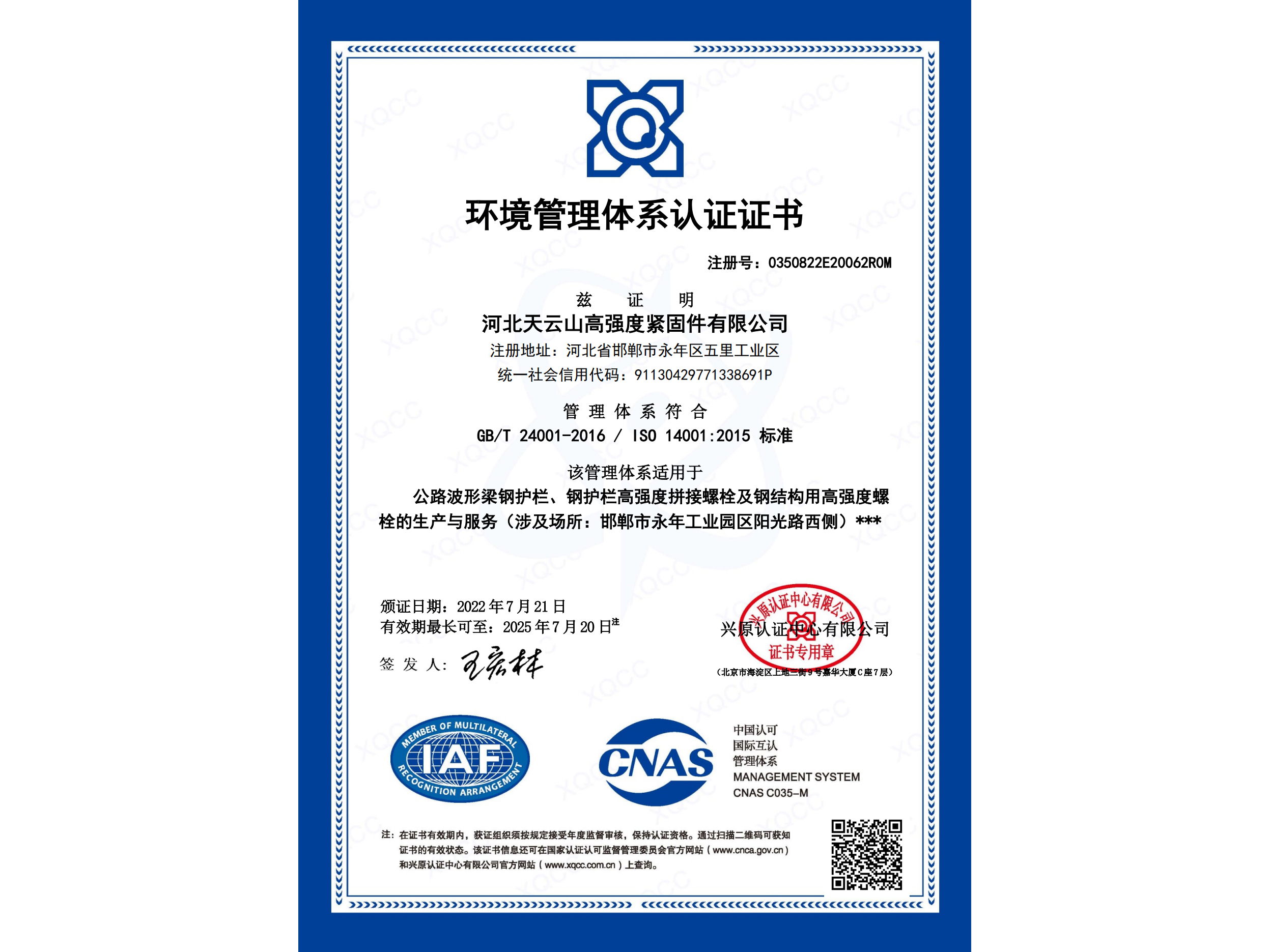 環(huán)境管理體系認證證書