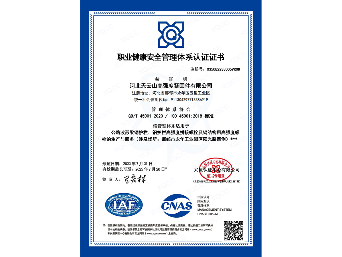 職業(yè)健康安全管理體系認證證書